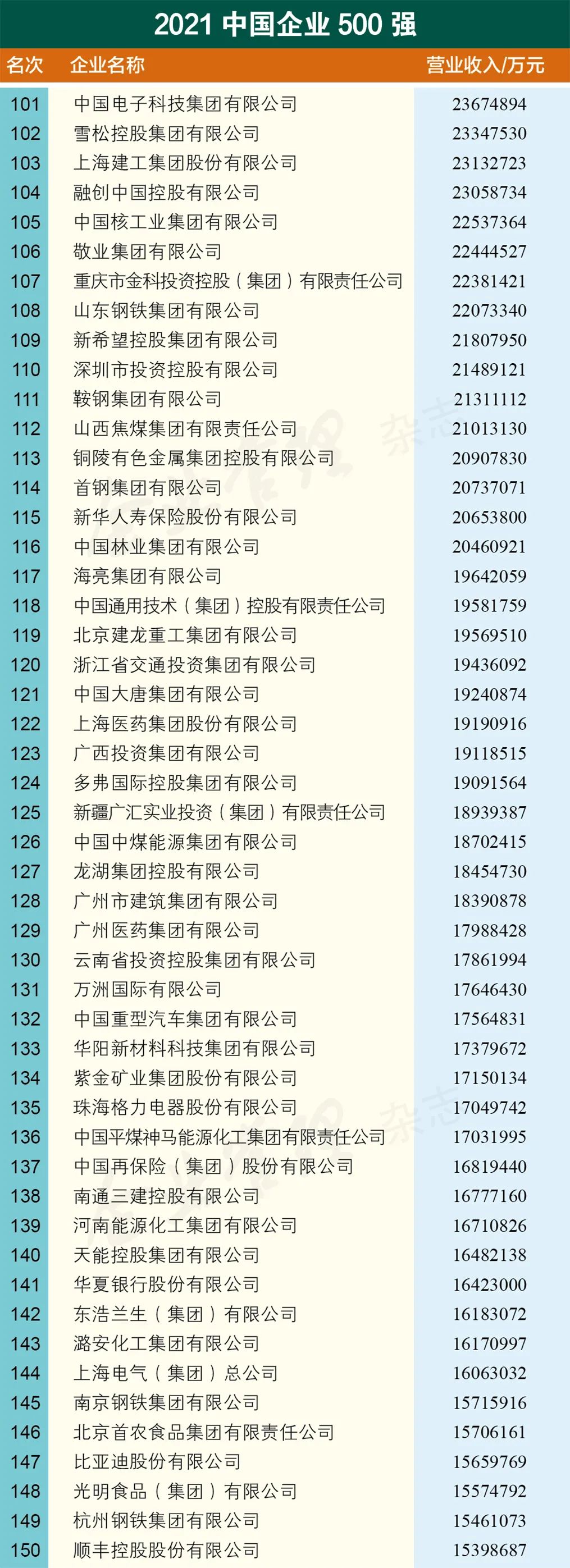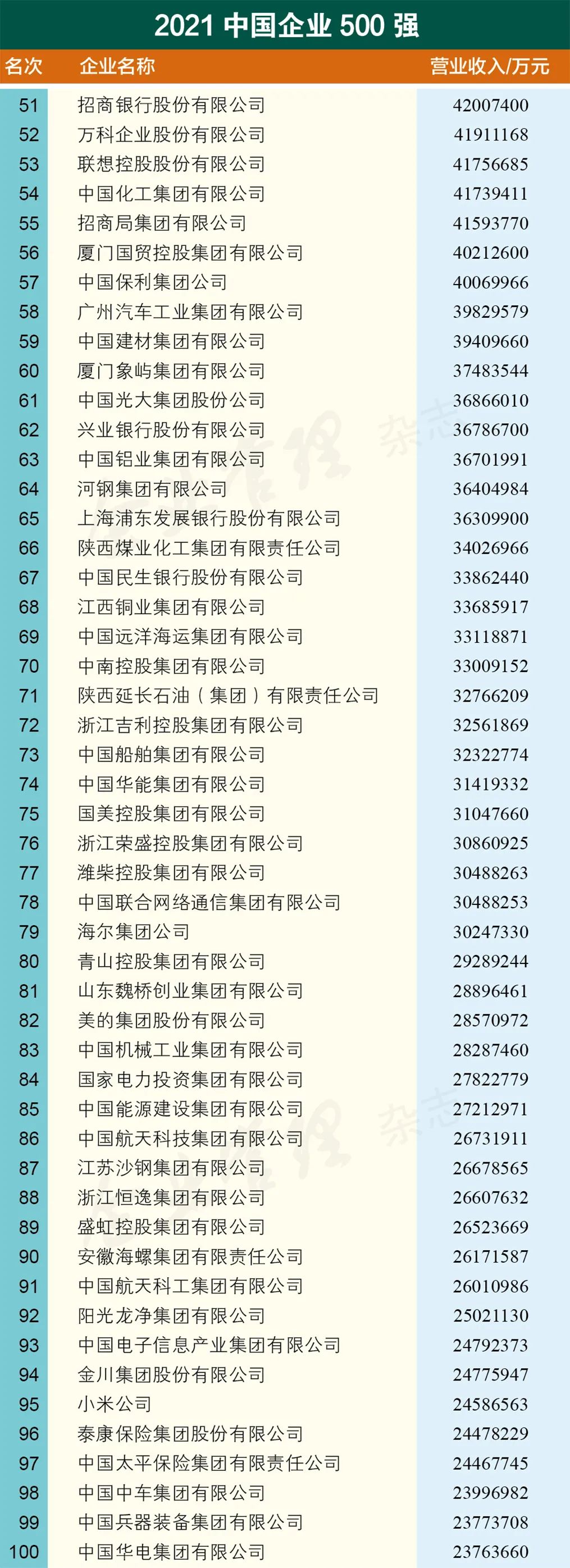 9月25日,中国企业联合会、中国企业家协会发布了2021中国企业500强、中国制造业企业500强、中国服务业企业500强、中国100大跨国公司、中国战略新兴产业领军100强、中国大企业创新100强企业名单及其分析报告。