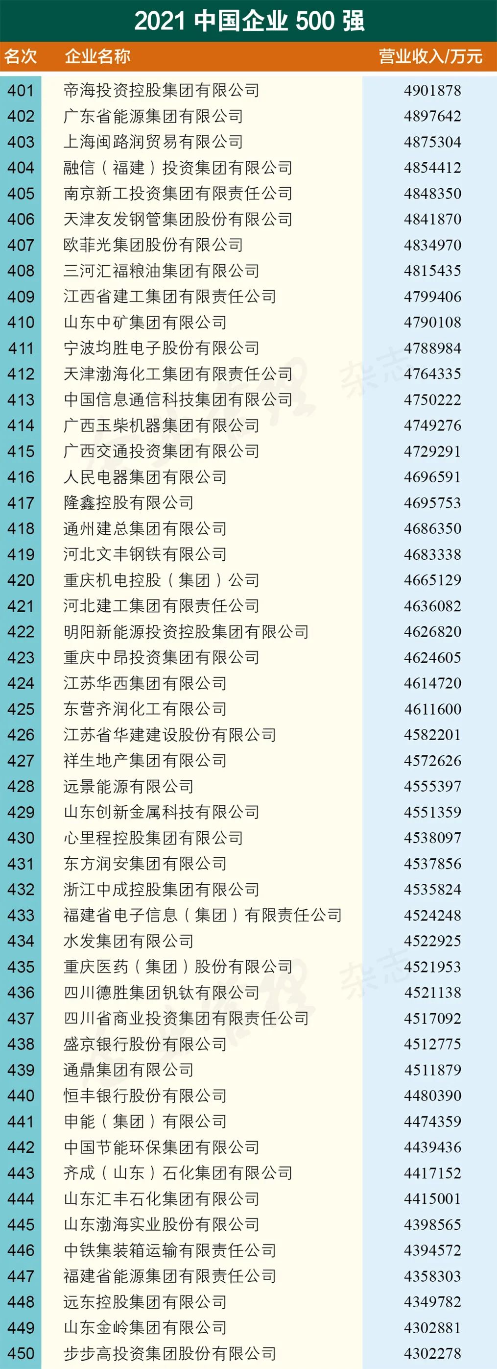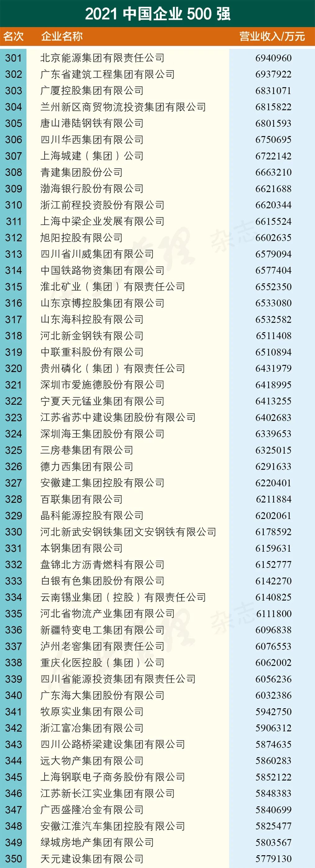 2021中国企业500强名单