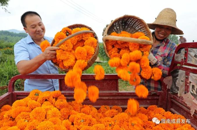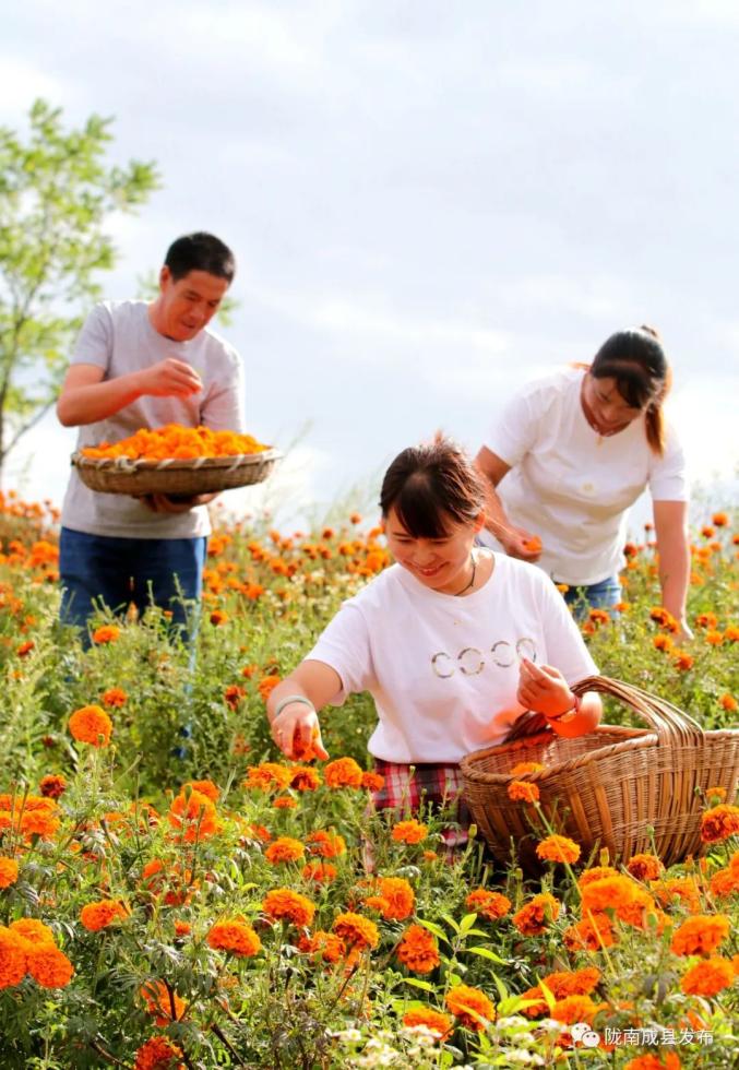 成县鸡峰镇西山村群众采摘万寿菊 刘敏 摄