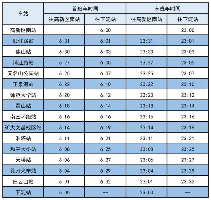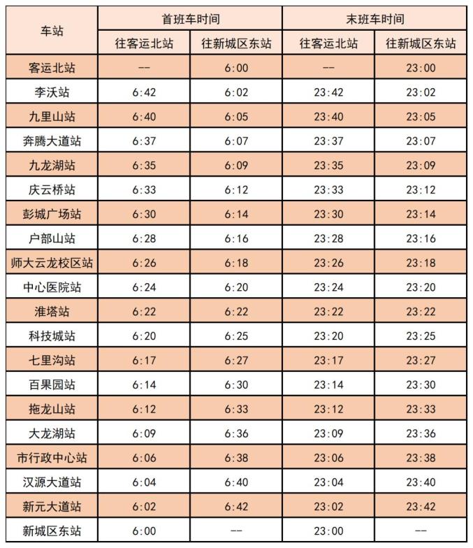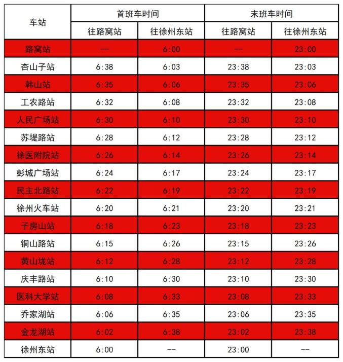 徐州地铁1、2、3号线首末班车时刻表