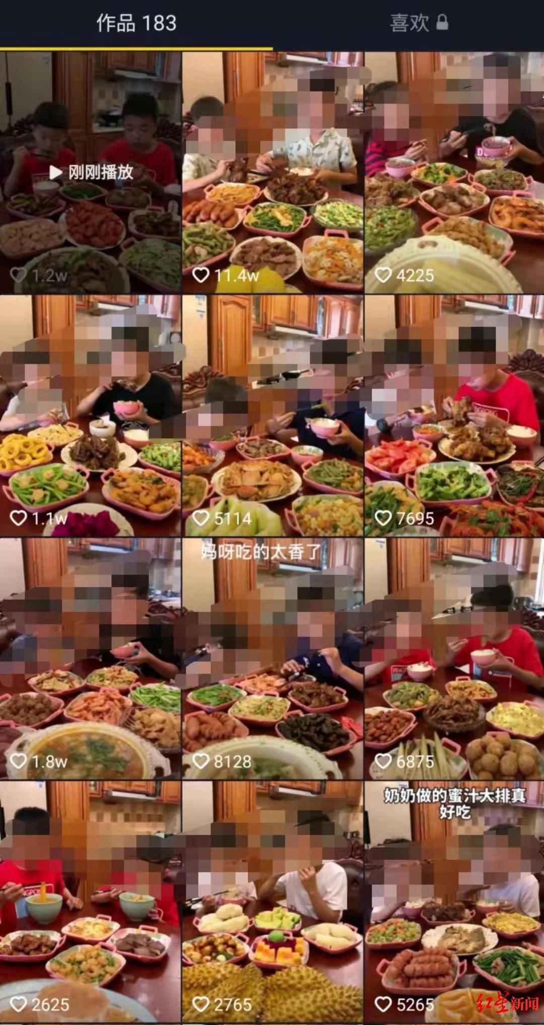 红星新闻记者看到,在抖音平台一个账号中,经常发布两个儿童坐在餐桌前“狼吞虎咽”。该账号内容基本雷同,从2020年开始,每个视频都是同一角度,桌上摆着5-6盘螃蟹、虾、牛羊肉等大餐,两个孩子大快朵颐。“这样不浪费吗?吃不完剩下的如何处理?”有网友认为,这与“吃播”无异。