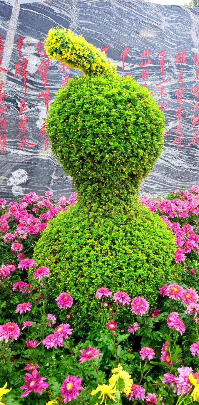 人民广场南侧的菊花还有葫芦造型 ,寓意 “福禄”26日下午,冒着微微细雨,记者徜徉在人民广场和竞秀书院,金秋时节欣赏正在布展中的各色菊花。作为保定的市花,风姿绰约的菊花一直受到古城人民的喜爱。早在1989年,我市就开设了第一届金秋菊展,今年是第22届。