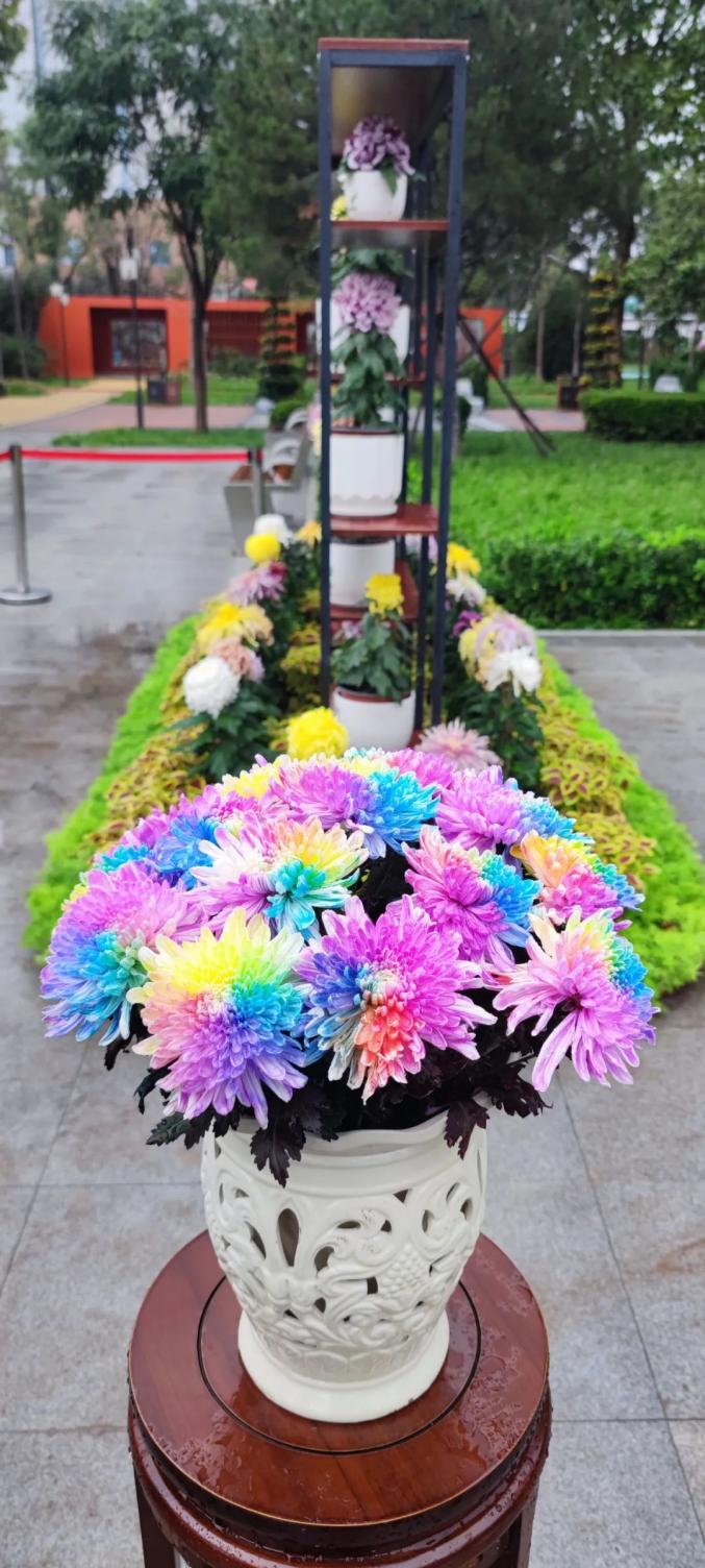 在南广场,4盆七彩菊花分外美丽,吸引了很多市民的关注。只见在古香古色的盆架上,栽种于花瓶中的七彩菊,在阳光下分外炫目。该菊花花朵饱满、色泽渐变,红黄蓝绿紫等多种颜色交织其上,艳丽异常,深受网友的喜欢,是有名的“网红”菊花之一。