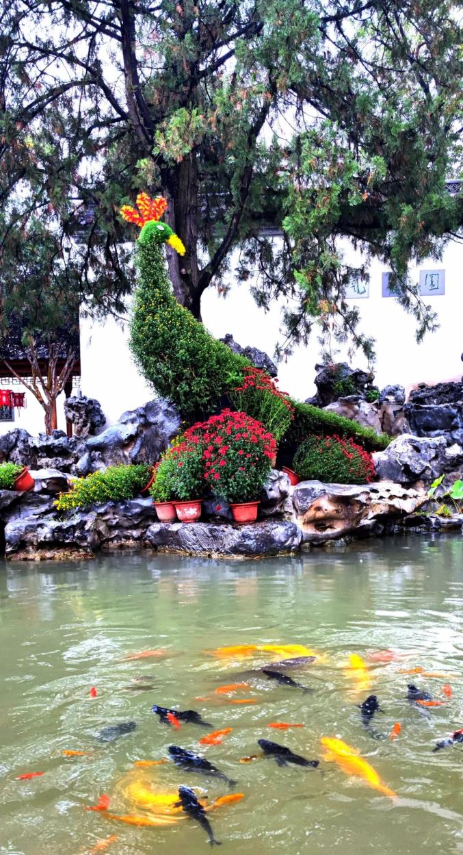 竞秀书院湖内的鱼儿,对凤凰造型的菊花也很喜爱