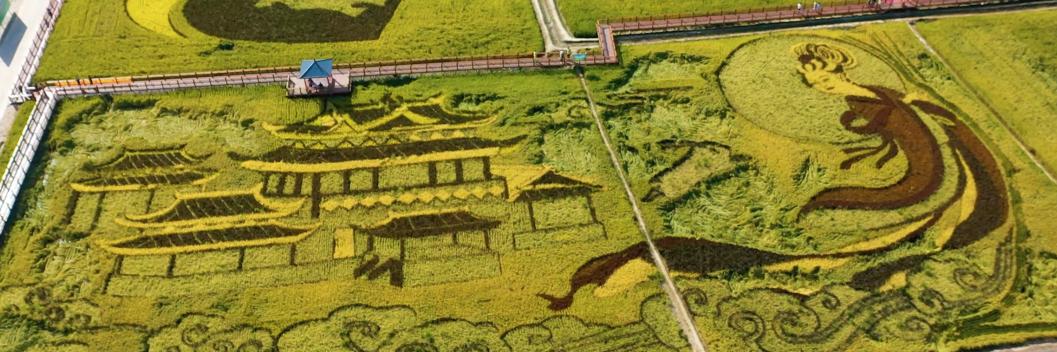 地址:松原市乾安县大遐农场水稻主题公园登上三层高的观光塔,会看到许多紫红色、黑色、金黄色的旱稻,这些旱稻构成了这一幅幅精美绝伦的稻田画。