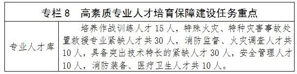 加强人才保障建设。完善消防救援人员招录、引进和培养机制,突出专业导向,增强专业化精度。建立健全岗位培训、业务集训、资格培训和任职培训的全方位教育培训体系,鼓励支持消防指战员通过在职教育培训提升专业素质和学历水平。规范消防专业人才库建设,实施专业人才重点培养工程,打造高素质专业消防人才队伍。完善符合消防救援高危职业特点的保障机制,强化落实工资待遇、伤亡抚恤、家属随调、子女教育、交通出行、看病就医、住房保障等专门政策,做好政府专职消防队员、消防文员和其他应急救援队伍的改革配套与保障落实工作。建立尊崇消防救援职业的荣誉体系,完善符合职业特点的表彰奖励制度。将消防救援人员职业保障工作纳入政府督查内容,推动各地区各部门落实相关责任。