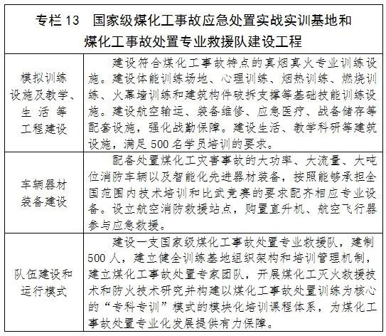 在鄂尔多斯市建成国家级煤化工救援专项训练基地,并组建一支具备处置煤化工事故攻坚能力的国家级专业化队伍,配套建成煤化工救援模拟训练设施,承担全国煤化工事故处置技术培训和比武竞赛。
