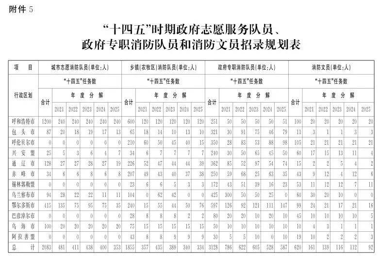 5.“十四五”时期政府志愿服务队员、政府专职消防队员和消防文员招录规划表