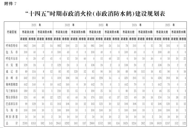 7.“十四五”时期市政消火栓(市政消防水鹤)建设规划表