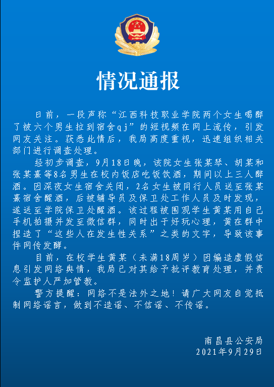 江西警方通报网传两女生被拉进男生宿舍强奸:系捏造实为醒酒