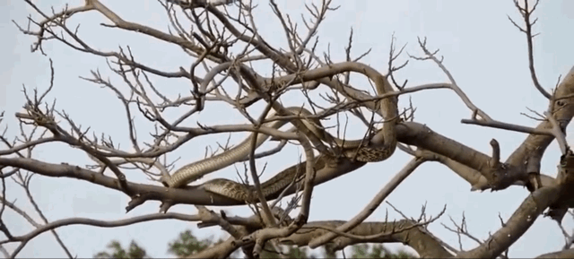 蛇会在树上盘踞,寻找合适的猎物或是可吃的食物,有时也会将整一棵树都当做自己的地盘*微博@萌物部落圈