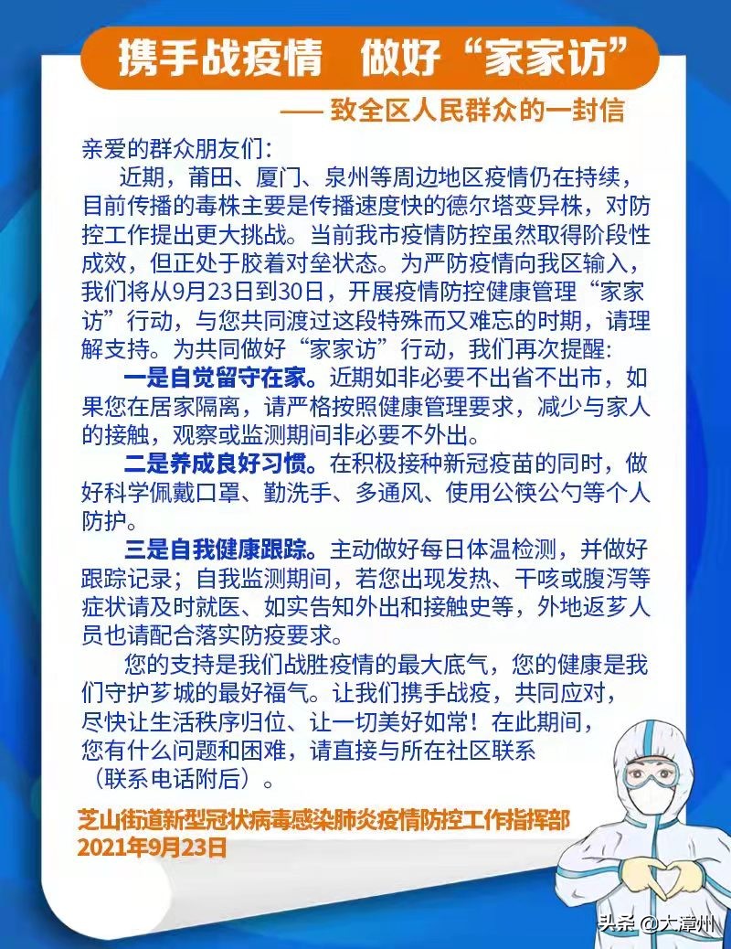 在抗击新冠疫情的重要关头,为进一步落实“外防输入、内防反弹”防控策略,芗城区芝山街道高度重视,严格按照要求,认真采取措施,迅速贯彻落实,第一时间开展疫情防控健康管理“家家访”行动。