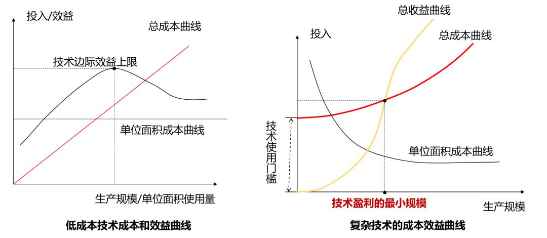 图 2 低成本技术和复杂技术的成本效益曲线分析如图2所示,化肥、农药、小型农机等低成本技术会达到效益的顶点,此时技术的边际效益为零。复杂技术的应用不仅需要高投资,对劳动者的素质和使用的规模都有一定的要求,当规模过小时,复杂技术的使用成本高于技术收益,农业生产处于亏损状态。