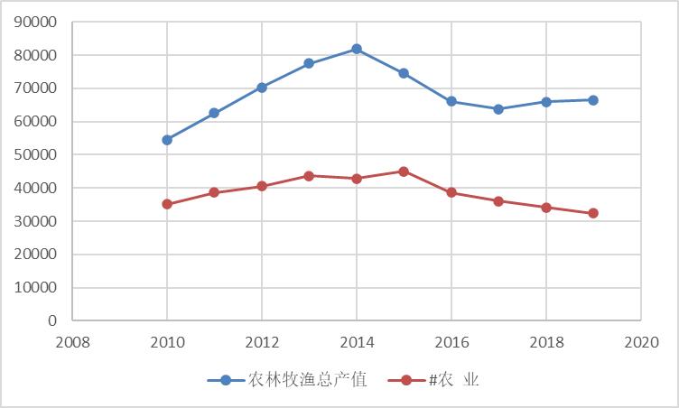 图 3 北京市平均每一从业人员创造的农林渔牧产值(元)如图3所示,北京市每一从业人员创造的农林牧渔产值在2014年达到顶点后开始下滑,近几年开始处于稳定状态,说明北京市农业在低成本技术红利达到极限后,处于“低水平均衡状态”。