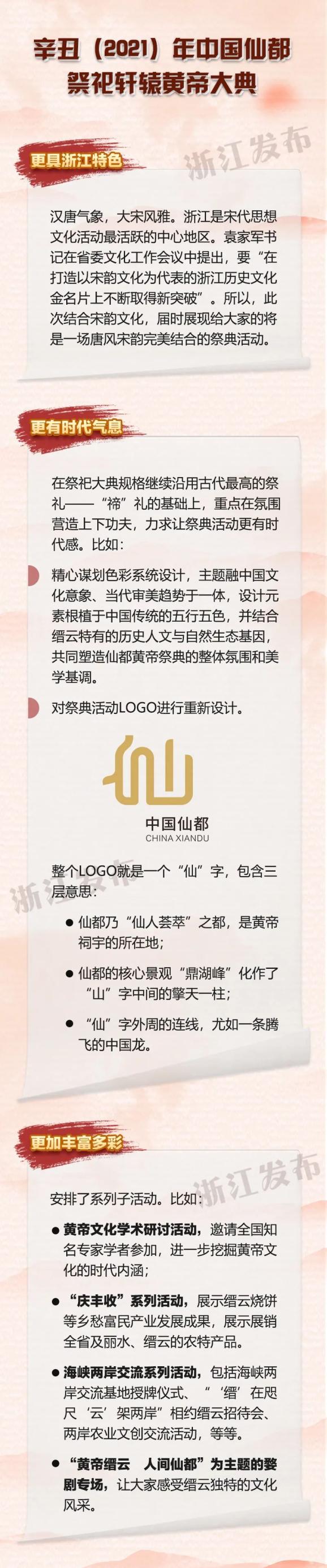 经全国清理和规范庆典研讨会论坛活动工作领导小组批复同意,辛丑(2021)年中国仙都祭祀轩辕黄帝大典将于10月14日(重阳节)在丽水市缙云县举办,主办单位为浙江省人民政府,承办单位为丽水市人民政府、缙云县人民政府。