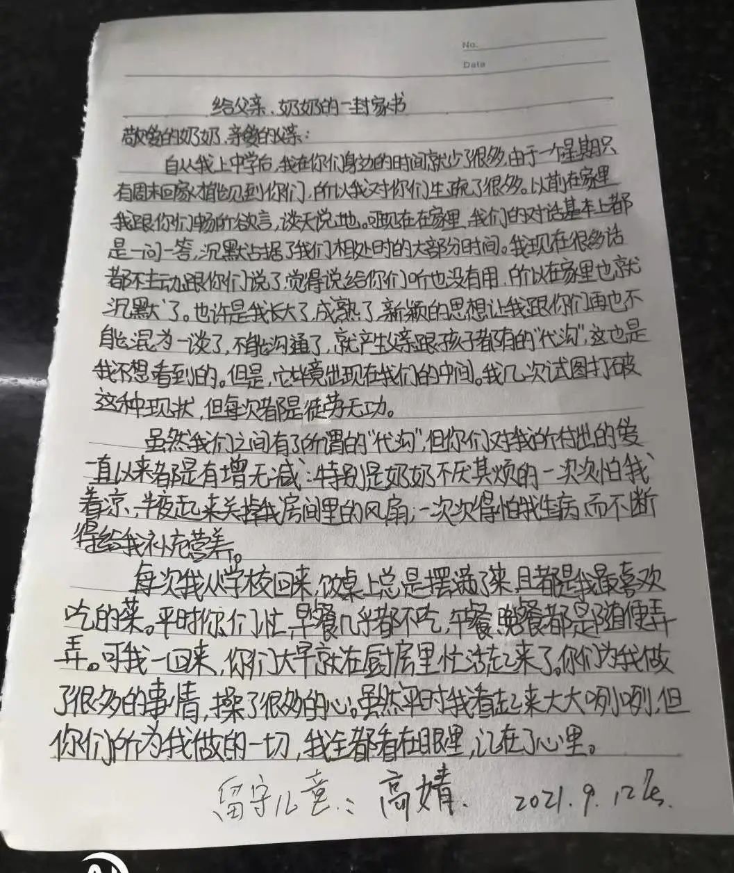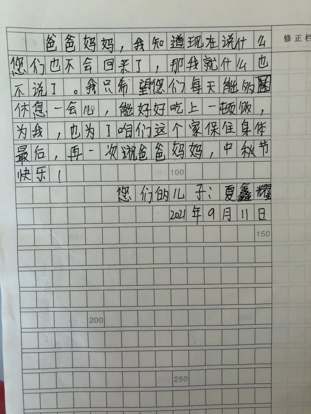 △范家岗村 祁宇恒大多数孩子的“家书”,不出意外的都是写给自己在外打工的父母。王家店村的小新(化名)在信中写到,不希望父母出去打工,他说,虽然知道父母是为了让自己“像城市里的孩子那样生活”,但比起更好的物质条件,自己更希望父母能够陪伴在身边;同时,也不希望每次见到回家的父母,又黑又瘦、饱经风霜、疲惫不堪。在信的最后,小新表示,知道自己无法劝说父母,只希望父母能够保重身体,不要过度劳累。