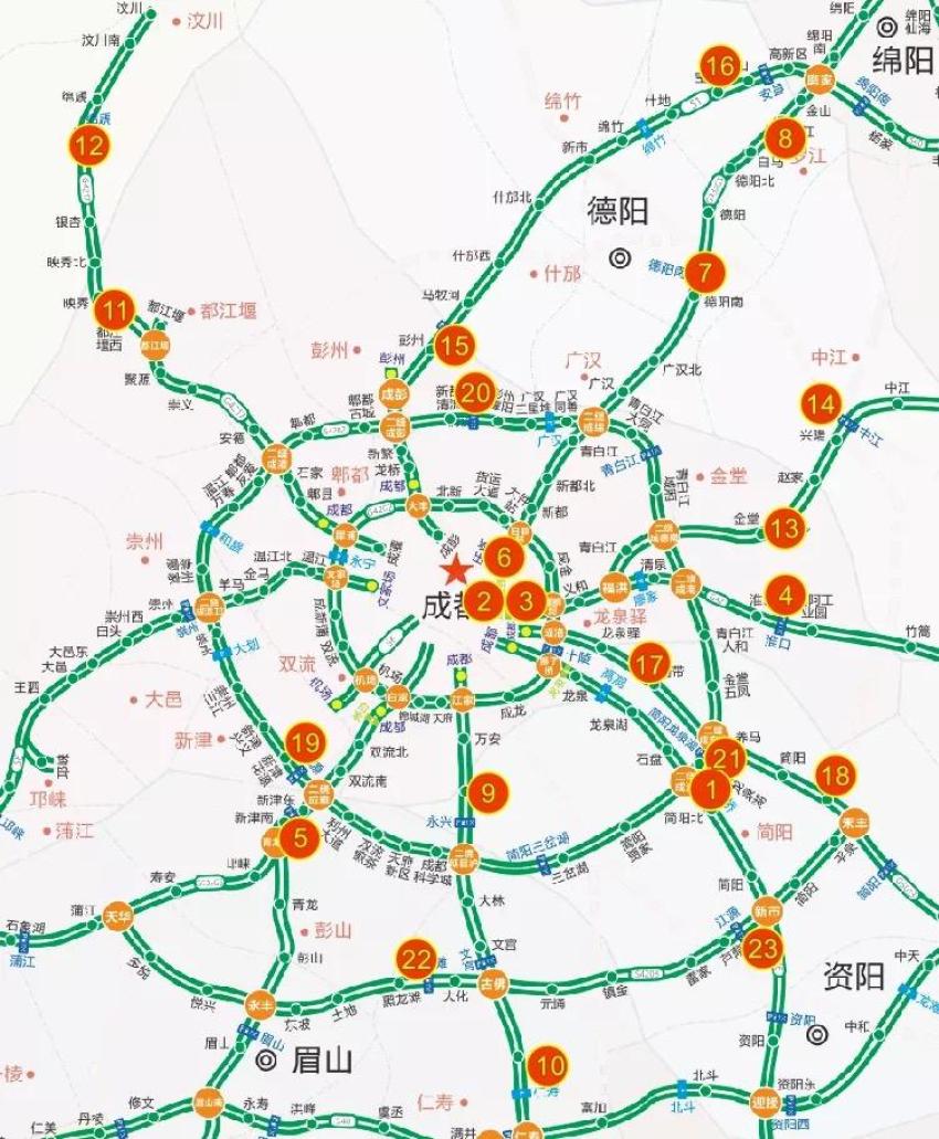 S1成绵复线高速彭州服务区(15号)、安州服务区(16号)G5013渝蓉高速(成安渝)洛带收费站(17号)、简阳服务区(18号)