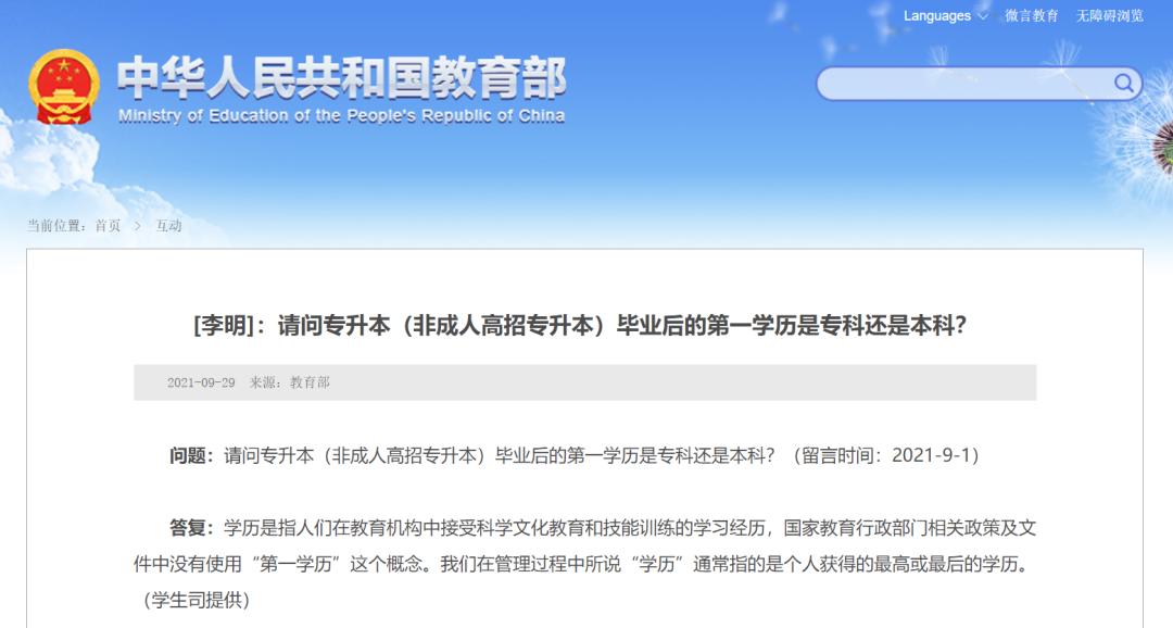 9月初,有网友向教育部提问:“请问专升本(非成人高招专升本)毕业后的第一学历是专科还是本科?”
