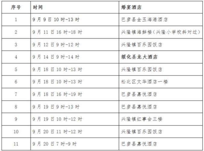 9月18日,南岗区卡伊娃桌游吧,南岗区哈西万达一楼九门重庆老火锅,巴彦县兴隆林业局富民家园4号楼,巴彦县兴隆林业局酷贝理发店,巴彦县百乐园饭店。