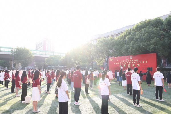 清晨七时整,上海交大医学院400余名师生在操场整齐列队,注视五星红旗冉冉升起。