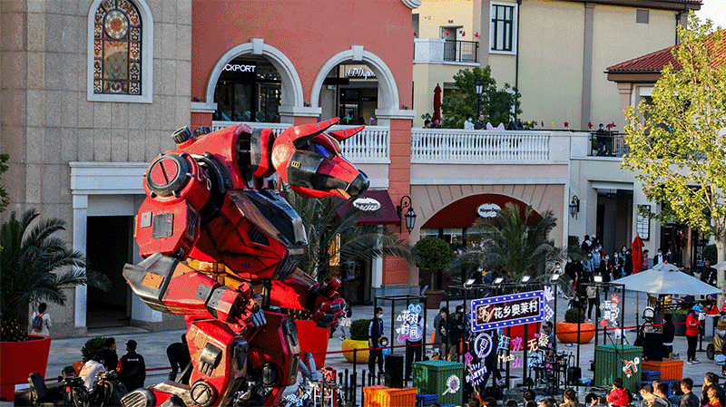 巨型机械造型搭配灵活互动的小型装置,为游客带来声临其境的感官体验,适用于日夜间演绎。山海神兽是国潮内核X西方机甲语言,艺术x科技x文化的载体,与广州融创乐园展现本土文化、中西合璧的理念不谋而合。
