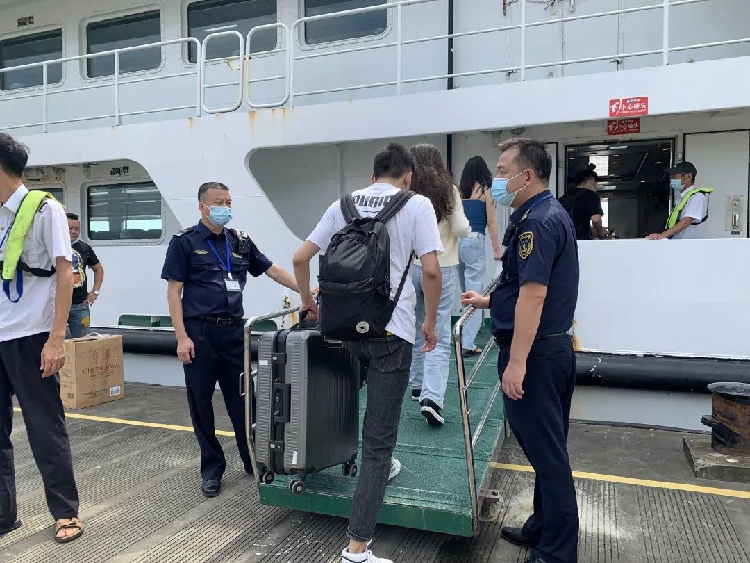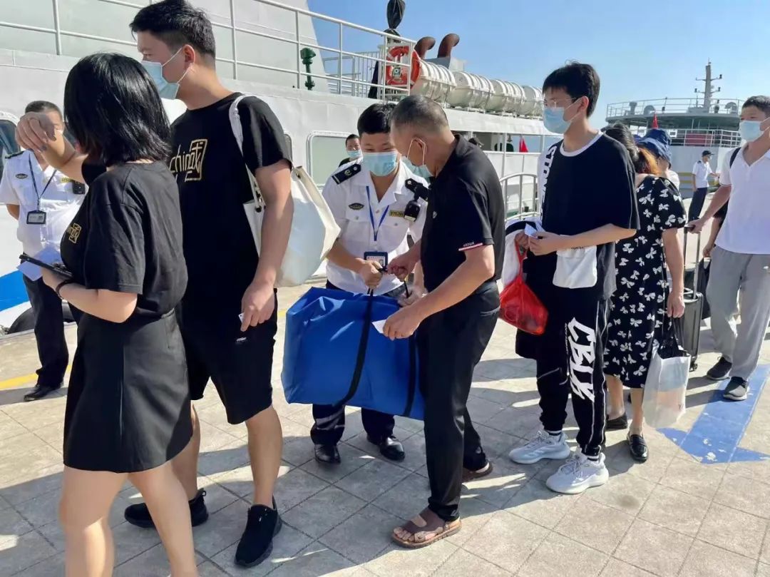 国庆首日,温州南麂岛迎来海岛游高峰,温州海事人组织开展站高峰工作,执法人员在现场维护旅客上船秩序,提醒旅客戴好口罩。
