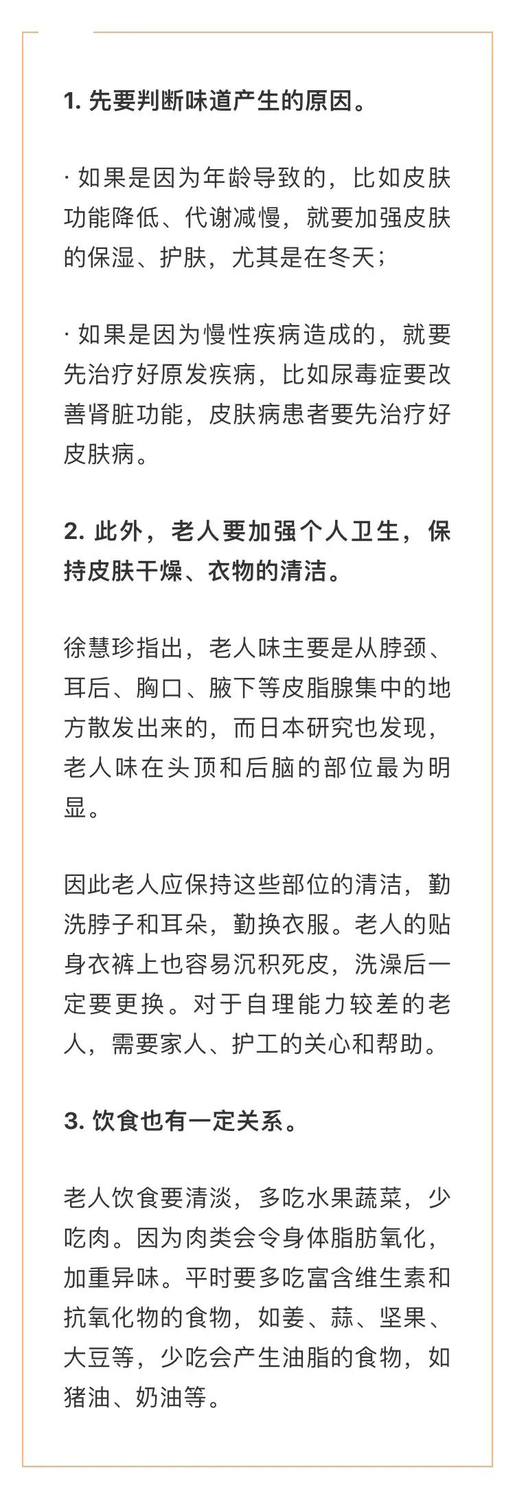 “老人味”并非无法预防和去除。徐慧珍医生指出,要想去除老人味,记住以下几点: