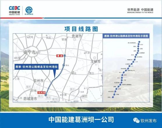 鹿寨至钦州港高速公路横县至钦州港段项目由葛洲坝集团股份有限公司按照PPP模式进行建设,全线长160.9公里,南宁市境内36.4公里,钦州市境内124.5公里。