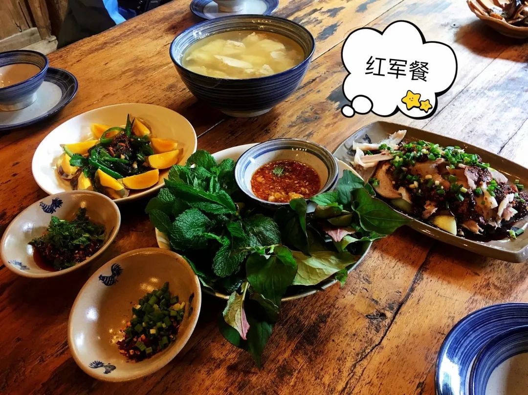 五谷饭、蒸红薯/土豆、南瓜汤、干辣椒、山野菜……老区流行的红军餐非常健康,现在生活水平提高了,像红军餐这样的饮食方式,倒是应该多多提倡。