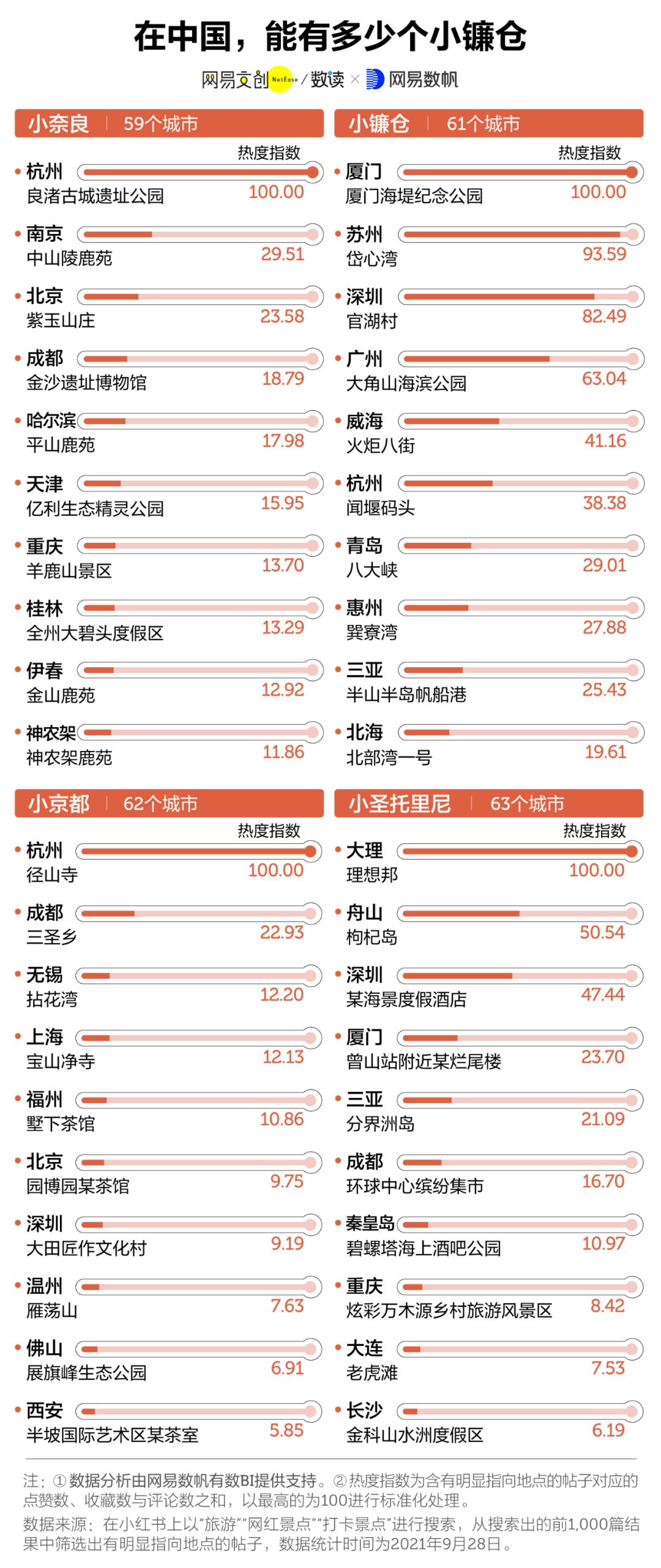 为了搞清楚“小”字辈景点到底多风靡,我们对“小奈良”“小镰仓”“小京都”“小圣托里尼”相关的各前 1000 篇帖子进行了分析,并和实际地点进行了匹配。