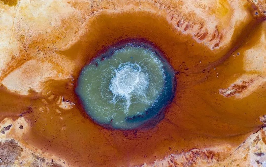 航拍的艾肯泉,泉眼和喷涌出的泉水跟周围深红色的土地形成了瞳孔的形状,也被称为“恶魔之眼” / 视觉中国