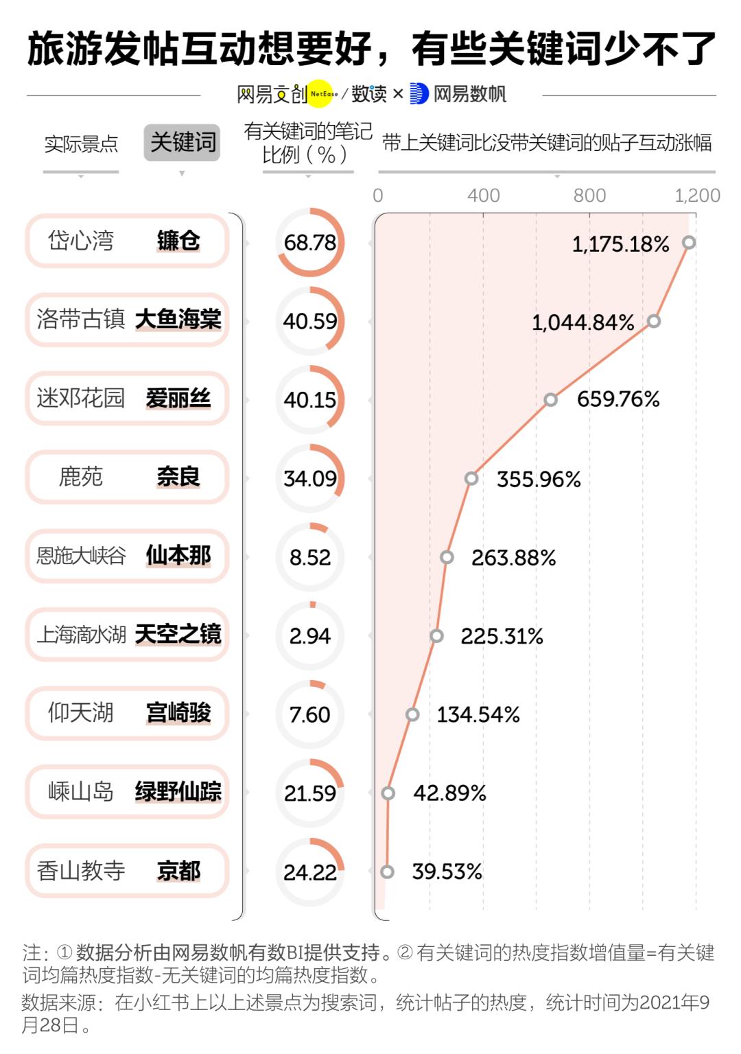 在小红书上,岱心湾带有“镰仓”关键词的帖子占比达到 68.78%,以点赞数、收藏数和评论数为互动衡量指标,相比没带关键词的帖子互动,带上关键词的帖子互动涨幅高达 1175.18%,效果好了 100 多倍。