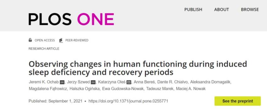 实验结果发现:7天的恢复期过后,参与者在大多数功能测量方面尚未恢复到规律生活的表现。从大脑活动的几种脑电图测量、腕部传感器捕获的休息与活动模式以及回答问题的准确性来看,只有受试者的反应时间恢复到了最开始的水平,行为、认知功能、注意力、运动、记忆和神经生理反应等方面仍存在差异。