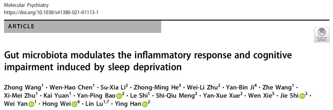 2021年5月,北京大学第六人民医院的陆林院士研究团队在《自然》的旗下子刊《Molecular Psychiatry》发表重要研究成果,他们发现睡眠剥夺(SD)引起肠道菌群紊乱,诱导中枢神经炎症及小胶质细胞的活化,最终导致认知功能受损。②