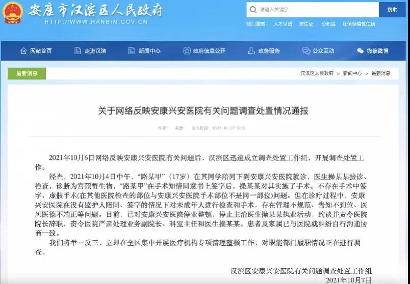 今天(10月7日)中午,安康市汉滨区人民政府官网再发通报称,经查,10月4日中午,“路某甲”(17岁)在其同学陪同下到安康兴安医院就诊,医生操某某接诊、检查,诊断为宫颈赘生物,“路某甲”在手术知情同意书上签字后,操某某对其实施了手术。不存在手术中签字、虚假手术(在其他医院检查的部位与安康兴安医院手术部位不是同一部位)问题。通报显示,但在诊疗过程中,安康兴安医院在没有监护人陪同、签字的情况下对未成年人进行检查和手术,存在管理不规范、告知不到位、医风医德不端正等问题。