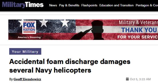 美军机库快速释放消防泡沫灭火尽管迈尔斯拒绝透露直升机的受损程度,仅表示该中队仍有充足的剩余直升机,不会对日常任务造成影响。但美国海军安全中心将该消防泡沫排放事故标记为“A级事故”,意味着它造成的损失将超过250万美元,恩,的确算得上是损失惨重了。