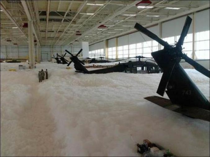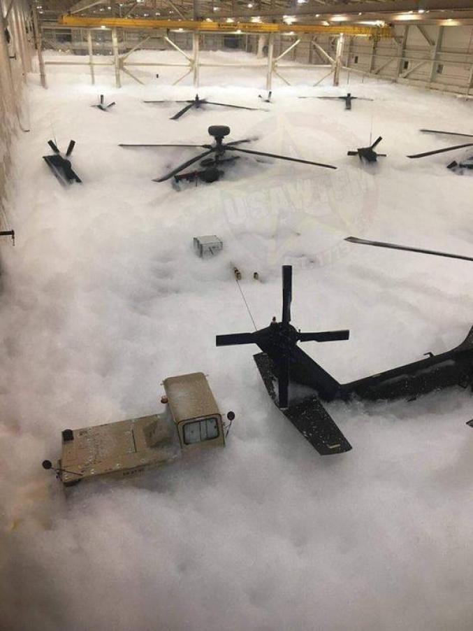 2018年,阿拉斯加州温赖特堡基地的直升机机库消防系统被意外触发,多架“阿帕奇”和“长弓阿帕奇”武装直升机以及数架“黑鹰”直升机被厚厚的消防泡沫覆盖。