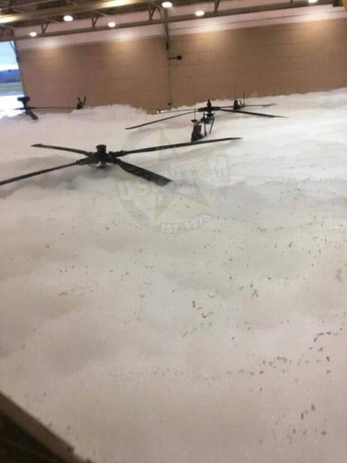 2014年的类似事故中,“黑鹰”直升机洗了一个“泡泡浴”比如2014年,俄克拉荷马州塔尔萨国民警卫队的机库也曾发生过类似的意外事故,6架“黑鹰”直升机被消防泡沫淹没。