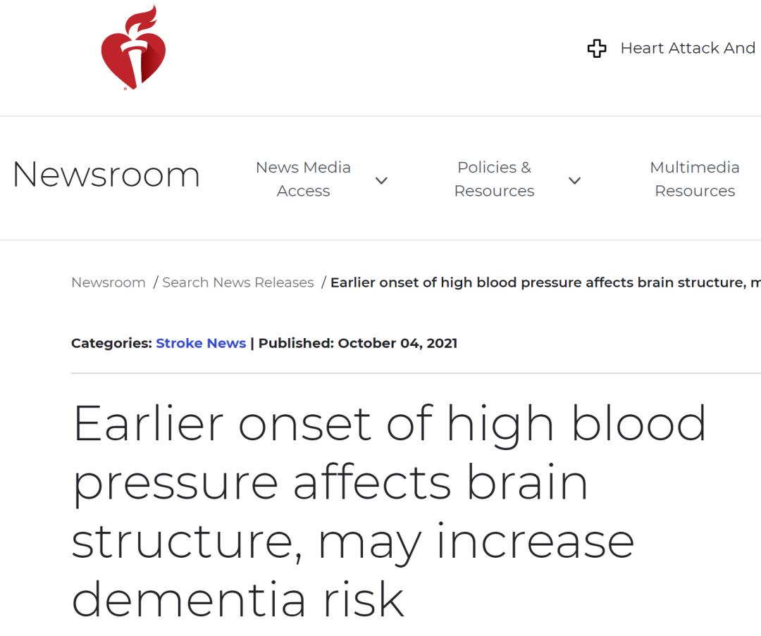 研究于2021年10月4日发表在《Hypertension》(最新影响因子:10.19)杂志上研究结果提高了在青年时期采取措施控制或推迟高血压发作可能降低失智风险的可能性。