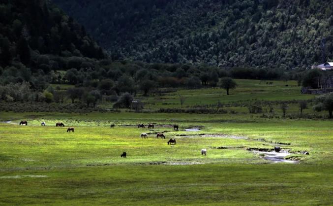 在普达措国家公园内,牲畜在洛茸村民小组附近的草甸上吃草 新华社记者 张誉东 摄