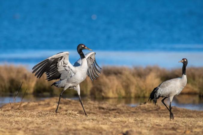 黑颈鹤在昭通市大山包大海子湿地嬉戏 新华社记者 胡超 摄