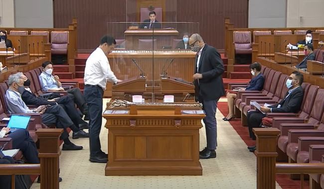 图5:10月5日,新加坡卫生部长王乙康(左)在国会接受对于防疫政策的质疑