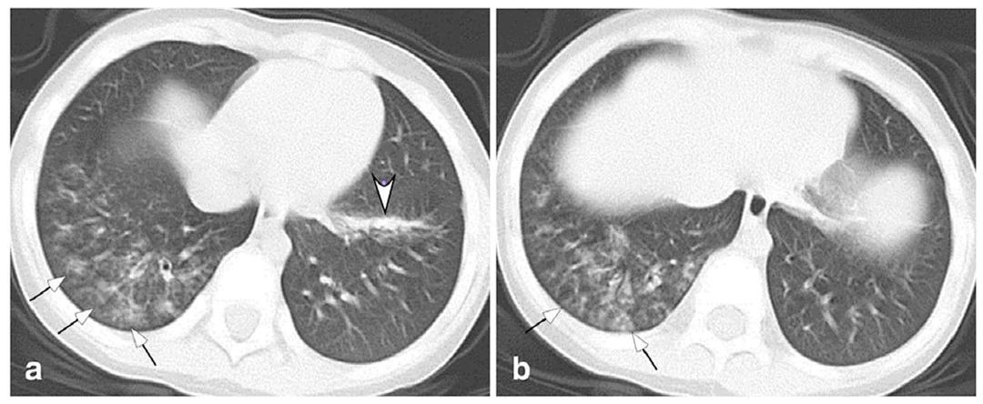 图中为一位4岁男童在发热伴咳嗽5天后的胸部CT图像,图中显示出多处毛玻璃影及零散的病灶。