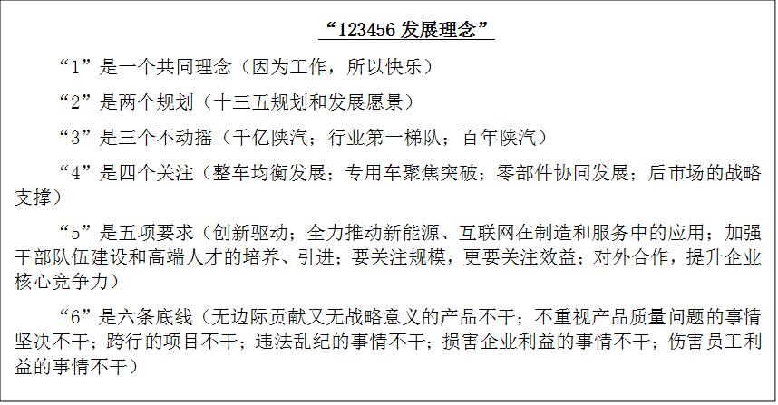 2.“德文化”内涵升级,提供发展新动力经过五十余载岁月洗礼,陕汽继承并发扬了中国传统文化对“德”的诠释,孕育并不断丰富和发展了独具个性的企业文化——德文化。以立德、尊德、行德为行动指南,形成了“以人为本、创优报国、追求卓越、迈向高端”的核心价值观;“德赢天下、服务领先、品质成就未来”的经营理念;“敬业、笃学、诚信、创新”的企业精神;“以客户为中心”的企业宗旨和“因为工作、所以快乐”的工作理念。步入二十一世纪的新时期之后,全新升级的陕汽特色“德文化”又拥有了新的内涵,其主要由“德赢天下”和“123456双理念”组成。