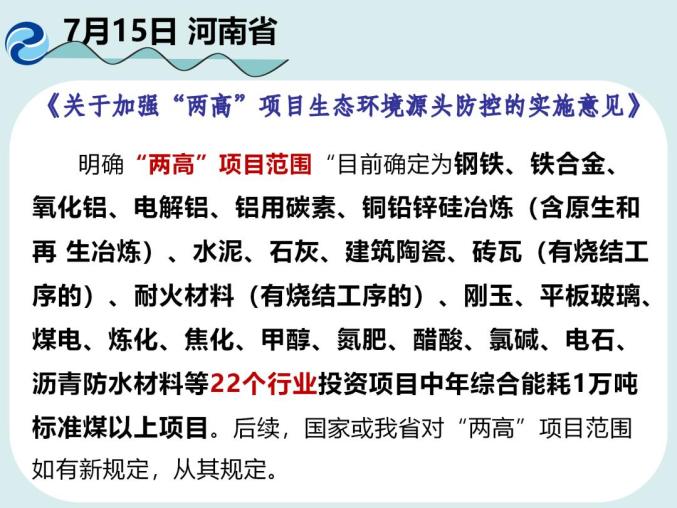 今年6月初,生态环境部发布《关于加强高耗能、高排放建设项目生态环境源头防控的指导意见》,其中明确:“‘两高’项目暂按煤电、石化、化工、钢铁、有色金属冶炼、建材等六个行业类别统计,后续对“两高”范围国家如有明确规定的,从其规定。”