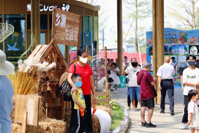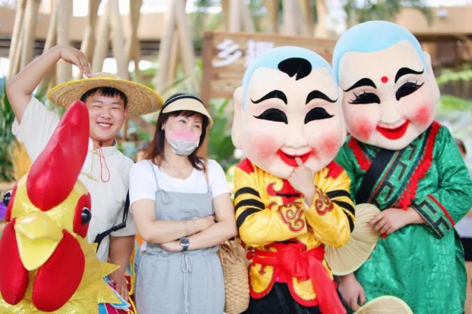 ▲现场游客合照(景区供图)在国庆期间,华侨城古劳水乡推出“2021乡趣生活节”。其中,假期第一天首发推出的“乡趣生活游园会”,在宾客中心设有多个乡趣体验打卡场景。