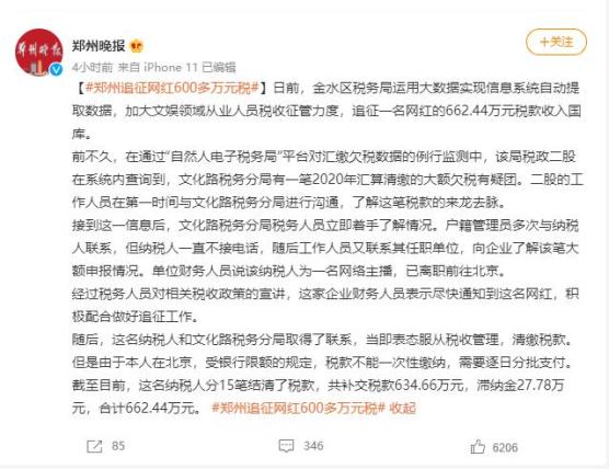 据郑州晚报微博,日前,金水区税务局运用大数据实现信息系统自动提取数据,加大文娱领域从业人员税收征管力度,追征一名网红的662.44万元税款收入国库。