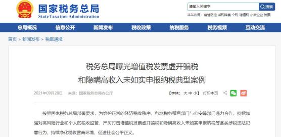 9月28日,国家税务总局曝光了一批增值税发票虚开骗税和隐瞒高收入未如实申报纳税典型案例,释放了对高收入者税收征管强化信号。