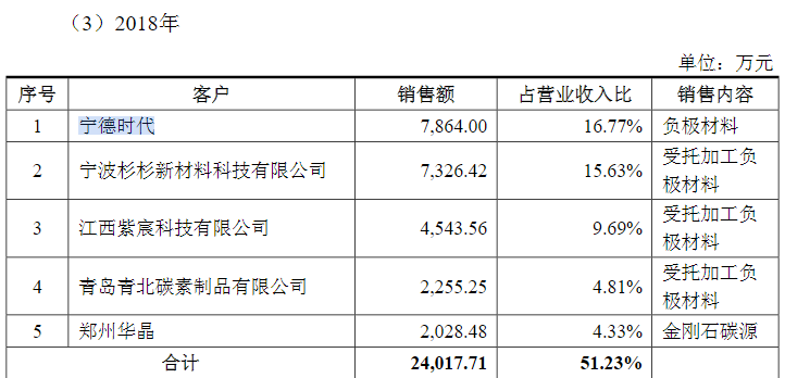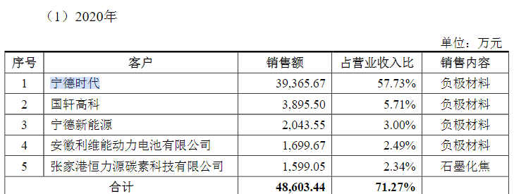 其中第一大客户宁德时代及其子公司的占比极重,销售收入分别为0.79亿元、3.23亿元、3.94亿元,占营业收入比重分别为16.77%、59.01%和57.73%;主要销售内容是负极材料,占同期负极材料的销售金额比重为73.88%、92.30%和79.39%。