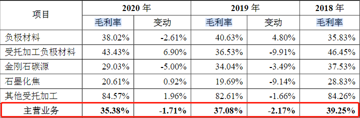 与此同时,毛利率逐年下降也是尚太科技需要警醒的一点。招股书显示,2018年-2020年尚太科技主营业务毛利率分别为39.25%、37.08%和35.38%,呈现逐年下滑趋势。